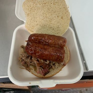 1 lb. Prime brisket, 1/2 rack pork ribs, 2 sausage link