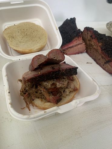 Sliced brisket, pulled pork and 1/2 Green's sausage link